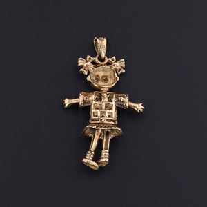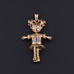This vintage pendant (circa 1970-1980) features a girl of 9ct gold, decked out in colorful glass accents. Her arms, legs and head are all moveable.