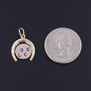 This vintage 14k gold spinner charm (circa 1950-1960) features a horseshoe with a disk that reads 'good luck' when spinning.