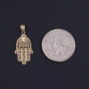 This 10k gold filigree pendant (circa 1980) features a hamsa, a palm shaped protective amulet.