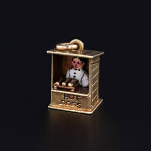 This vintage charm (circa 1940-1950) features a hot dog stand of 14k gold with a tiny enamel man inside. The bottom bears the makers mark for the renowned Sloan & Co of Newark, NJ.