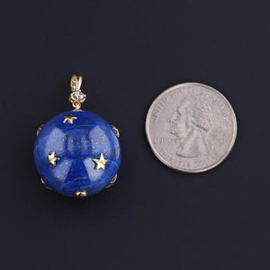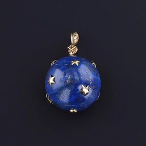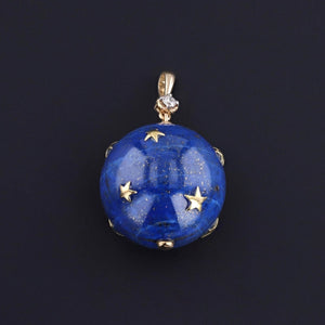 This pendant features a sphere of lapis lazuli with 18k gold stars and a 14k gold and diamond bail. The piece was one of two pendants that our jeweler created from a pair of vintage earrings (circa 1980).