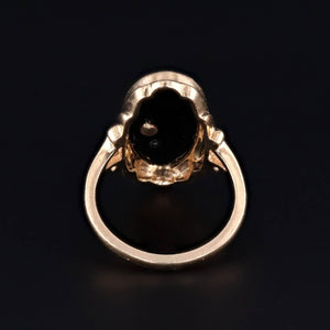 This ring features a 14k gold and simulated pearl man in the moon on onyx mounted in 14k gold.