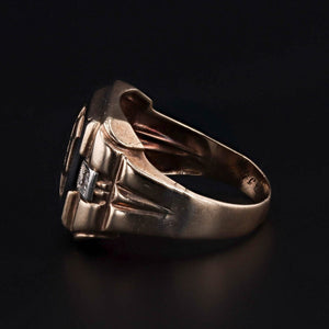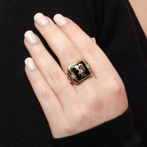 The face of the ring measures 0.7 inches by 0.8 inches wide, and the piece is in good condition. It is a size 10.5, but can be resized free of charge (with loss to the inside engraving). The ring weighs 6.16 grams.
