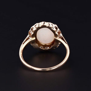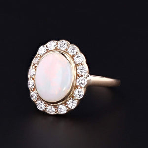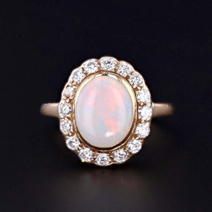 This simple, yet elegant ring (circa 1930-1940) features a white opal with subtle flashes of yellow, green, and orange. The opal is set into a 14k gold mounting (marked) and surrounded by a halo of 16 brilliant cut diamonds.