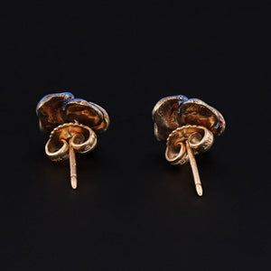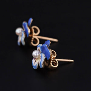 These earrings are solid 14k gold with hand painted enamel and pearl accents. Each earring measures 0.4 inches tall by 0.4 inches wide, and they are in excellent condition.