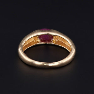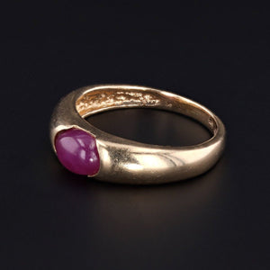This ring features a vivid, magenta hued, natural ruby cabochon set into a simple, 14k gold mounting.
