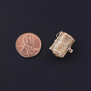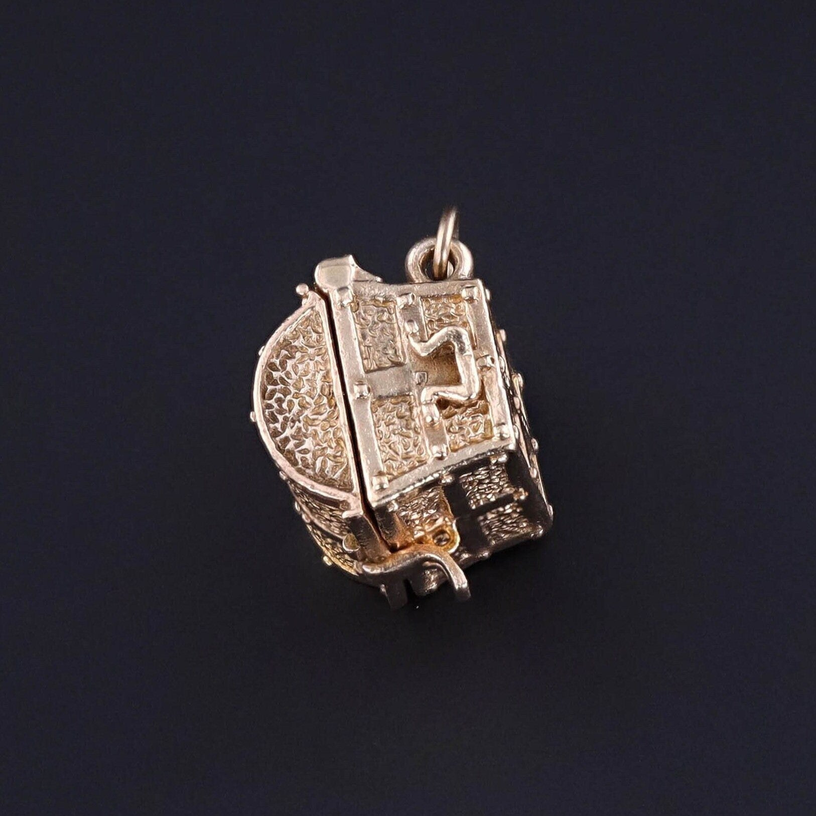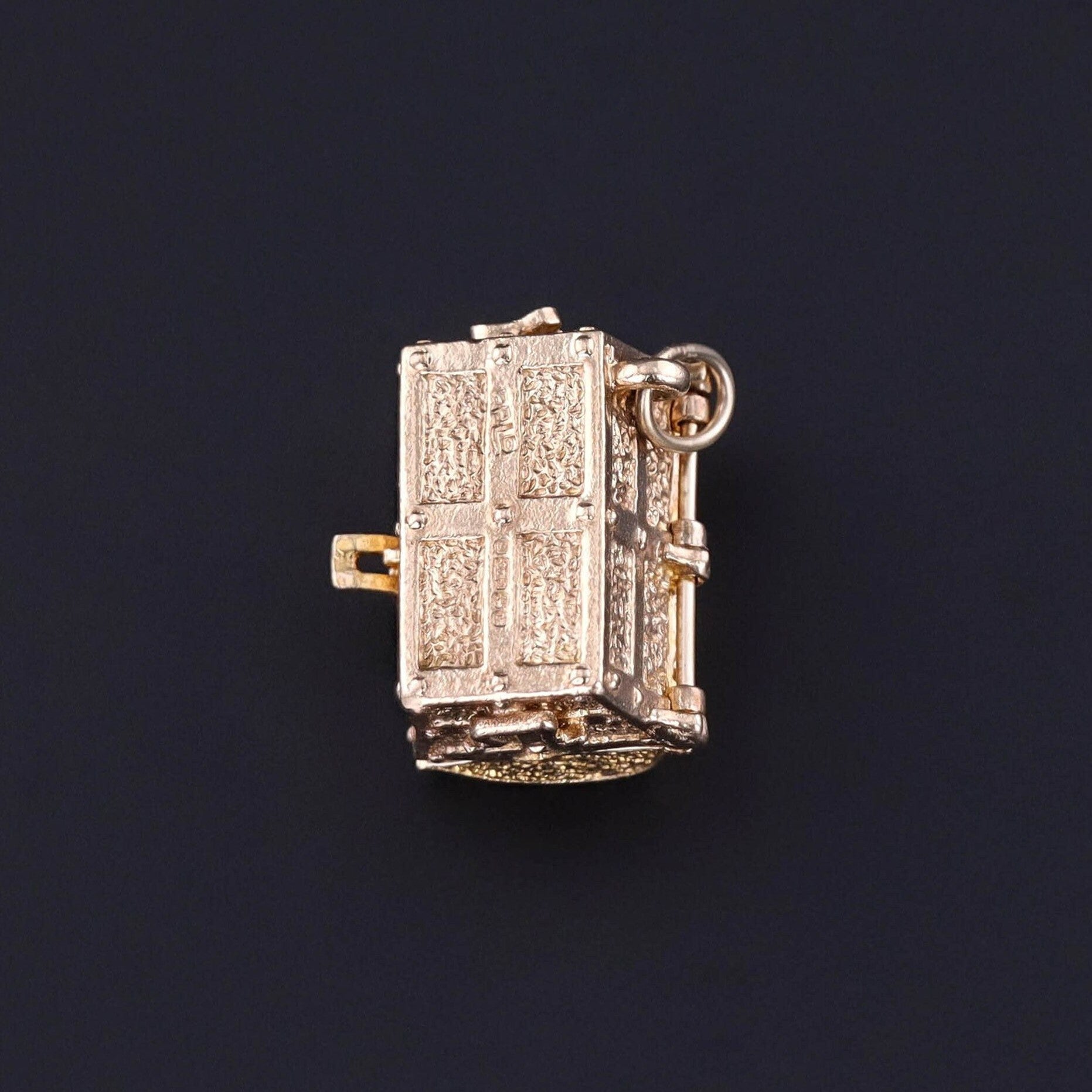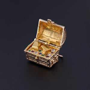 This vintage charm (circa 1950-1960) features a treasure chest of 9ct gold that opens to display assorted gemstones including diamonds, emeralds, rubies, and sapphires.