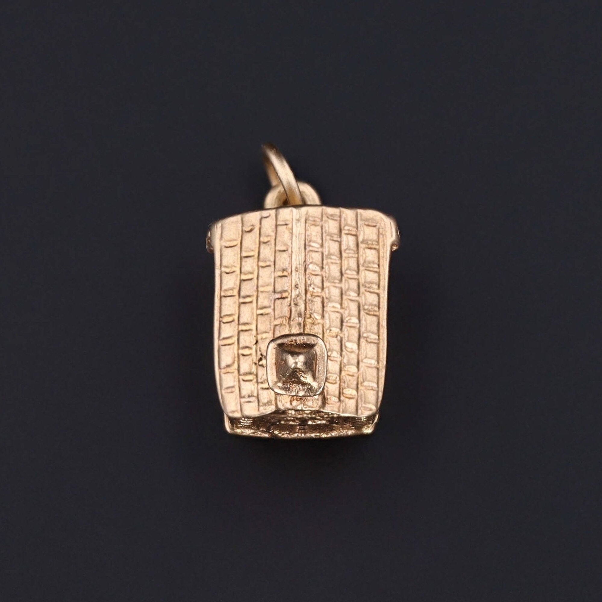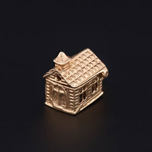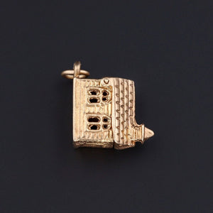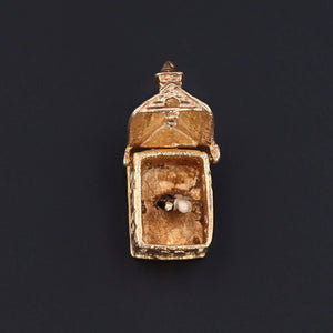 This vintage charm (circa 1950) is a 14k gold church that opens to reveal a bride and groom standing inside. The charm is 14k gold (marked), and it is in good condition with some minor enamel loss to the bride and groom.