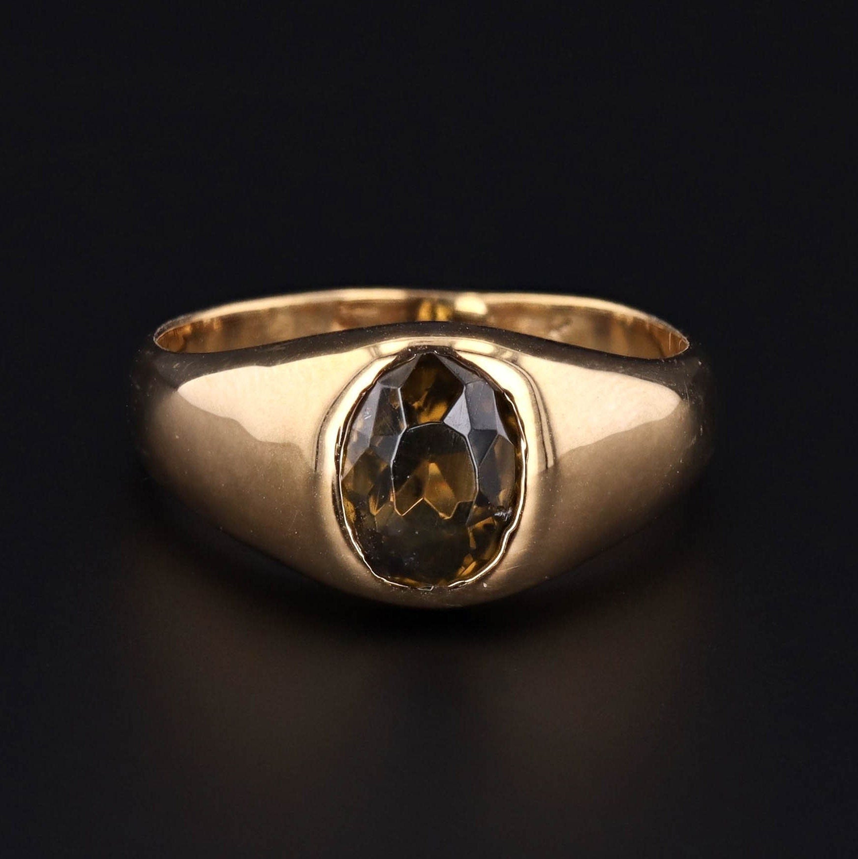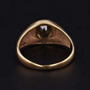 This vintage ring (circa 1970-1980) is made up of 14k gold and features a forest green zircon gemstone with hints of brown.